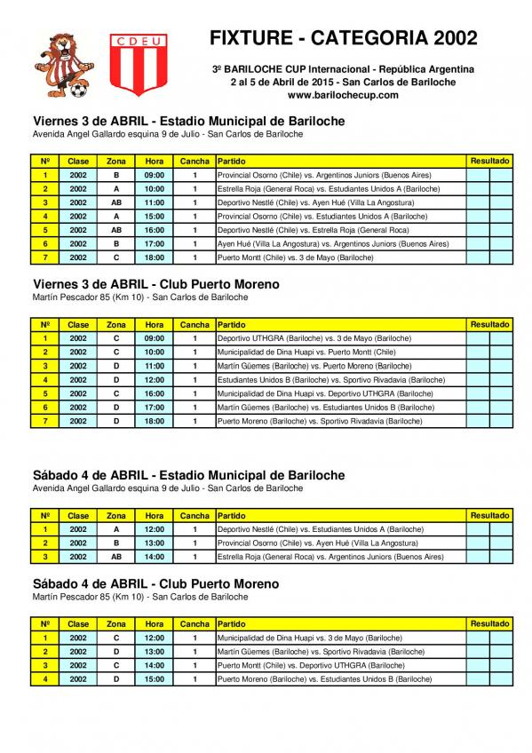 Fixture Bariloche Cup Categoría 2002 Viernes 3 y Sabado 4