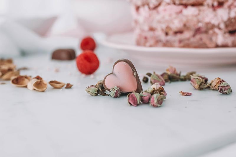 Decorar con merengues triturados, pistachos, frambuesas, pétalos de rosas y bombones en forma de corazón.