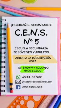 Desde la dirección del Centro de Educación de Nivel Secundario Nª 5 para jovenes y adultos, ubicado en Brown y Rolando, informó que ya están abiertas las inscripciones para el ciclo lectivo 2025.