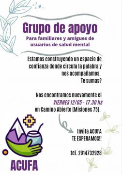 Desde la Asociación Civil de Usuarios, Familiares y Amigos de Salud Mental (ACUFA) crean un espacio esencial para el acompañamiento y la escucha a través de la conformación de un grupo de apoyo. Esta propuesta está pensada como un lugar de compañía para familiares y amigos de las personas usuarias de salud mental donde el intercambio de experiencias y el diálogo son la base de una escucha atenta y amorosa.