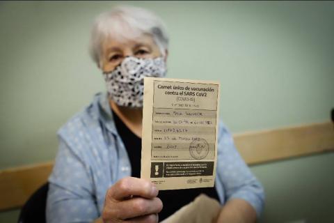 Mabel Sala, de 87 años, fue la primera de la tanda de adultos mayores en recibir la vacuna AstraZeneca este viernes (26/02) en el Hospital Zonal. “Todo funcionó diez puntos” dijo.