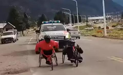 3500 kilómetros por el país a bordo de una bicicleta adaptada, la travesía inició en El Calafate y este lunes llegó al centro cívico de Bariloche, previo paso por la ruta 40 proveniente desde El Bolsón, escoltado hasta el centro de la ciudad por la policía rionegrina, luego de hacer un largo camino que él mismo calificó como que fue “bastante duro el tramo”.