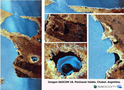 La primera imagen del satélite SAOCOM 1B fue captada sobre la Península de Valdés, en la provincia del Chubut. “En esta superficie el poder de penetración del radar SAR permite detectar el contenido de agua de la Salina Grande al Sur y del Salitral al Norte -tanto en la superficie como, incluso, dentro de la capa salina- que en la imagen se ve en tonos azulados. También se observan en tonos muy claros los acantilados, captados por el radar durante una órbita ascendente. En contraste, se ven zonas muy oscuras en la costa, esto es debido a la poca profundidad de agua y la falta de viento, que aquieta el oleaje y no producen retorno apreciable de señal hacia el instrumento radar. Hacia el Sur de la península, pueden observarse dos franjas oscuras que se corresponden con la erosión eólica del terreno, producida por dunas de arena que se desplazan por acción de los vientos”, informó la CONAE en un comunicado de prensa.