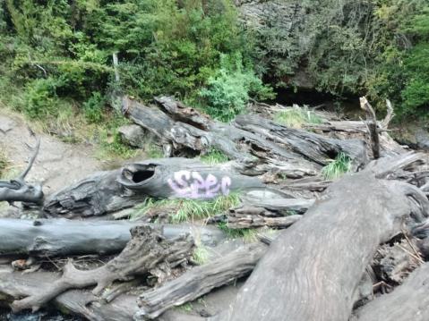 Guardaparques de la Zona Norte del Área Protegida, en su recorrida matutina habitual, encontraron en la Cascada Ñivinco un graffiti pintado en uno de los troncos adyacentes al salto de agua.