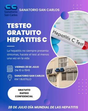 El próximo viernes 28 de julio, en conmemoración del Día Mundial de la Hepatitis, el Sanatorio San Carlos llevará a cabo una jornada de testeo gratuito de Hepatitis C. La actividad se realizará de 10 a 15 horas en el kilómetro 1 de la avenida Bustillo, con el objetivo de concientizar sobre esta enfermedad y ofrecer a la comunidad la posibilidad de realizarse un testeo rápido y confidencial.