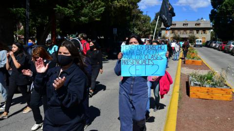 Estudiantes del CET 2, el CET 25 y la escuela secundaria 44 de Bariloche se movilizaron para exigir que el ministerio de Educación termine de poner en condiciones las escuelas y habilite las clases presenciales en esos establecimientos.