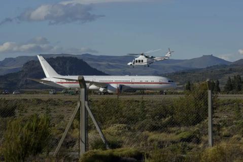 La aeronave tocó pista a las 18:45hs y, desde distintos puntos del perímetro, se pudo observar un importante despliegue de seguridad en la zona operativa. En la pista había al menos tres helicópteros preparados para el traslado inmediato de la comitiva.