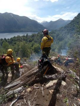 Respecto de los medios aéreos que operan en el incendio, en el día de hoy se sumó a los dos helicópteros con helibalde, dos aviones, también del SNMF, siendo uno de ellos un avión de carga de agua terrestre y un avión anfibio Fireboss, que carga agua directamente del lago. También se incorporó una embarcación de Prefectura Naval Argentina con técnicos de rescate, con el fin de dar cumplimiento al protocolo de seguridad inherente a la operación de dicha aeronave.