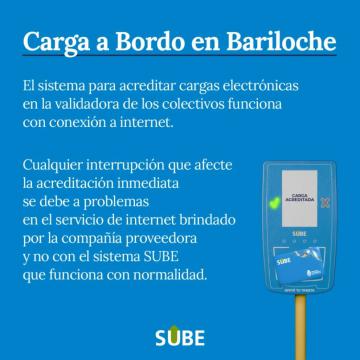 SUBE recuerda a los usuarios de la ciudad de Bariloche, que el sistema de Carga a Bordo, utilizado para acreditar cargas electrónicas en las validadoras de los colectivos, funciona mediante conexión a internet.