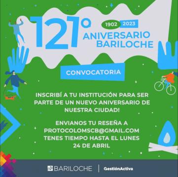 ¡La ciudad cumple años y estamos todos invitados! ¡Sumate, vos también sos parte de estos 121 años de historia! Con gran expectativa comienza a palpitarse este aniversario de nuestra ciudad y desde la Municipalidad de San Carlos de Bariloche, convocan a instituciones a sumarse al tradicional desfile que se realizará sobre la Av. Juan Manuel de Rosas.