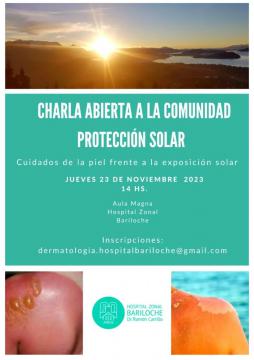 Así anticipandose a la época, se dictará una charla sobre cuidados de la piel frente a la exposición solar, en el aula magna del Hospital Zonal el día jueves 23 de Noviembre y tendrá entrada libre y gratuita. La inscripción y reserva se realiza al mail dermatologia.hospitalbariloche@gmail.com