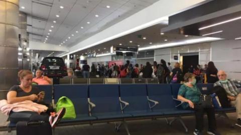 "Toman la temperatura solo en el ingreso al aeropuerto y hacen que la gente mantenga la distancia entre uno y otro pero después, no hay un asiento vacío en el avión; así que estamos sentados uno al lado del otro", comentó Gisela, una barilochense, durante la escala en Neuquén.