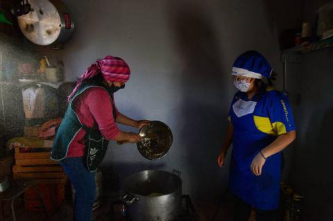 “Al principio yo traía algunas cosas de mi casa, verduras, fideos o cosas así”, cuenta Maricel mientras revuelve una olla en un pequeño cuarto de la casa de su madre, que cedió el espacio para que pudieran cocinar tres veces a la semana: miércoles y sábados entregan viandas y los viernes, la merienda para los niños.