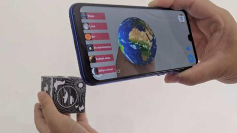 Para poder disfrutar de la realidad aumentada -es decir, la tecnología que permite superponer elementos virtuales sobre nuestra visión de la realidad-, se requiere previamente armar un cubo que se obtiene imprimiendo una plantilla que se descarga en la aplicación. Al rotar el cubo se podrá tener una experiencia virtual en 3D con imágenes del Sol, la Tierra, la Luna, cómo se produce un Eclipse Solar y Lunar, y los movimientos de rotación y traslación de la Tierra y la Luna. Cada opción cuenta con un audio explicativo.