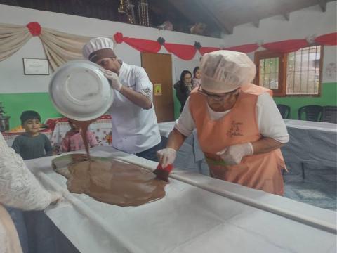 Mujeres de la Montaña elaboraron este sábado la barra de chocolate de 12 metros de largo en el barrio Pilar II. La iniciativa surgió hace cinco años con el fin de llegar a los chicos que no pueden estar presentes en "la barra más importante del centro".