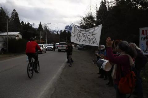 Vecinos y vecinas de Laguna El Trébol se concentraron en la rotonda que va hacia Colonia Suiza, del kilómetro 18,500 de avenida Bustillo, con carteles y folletos que entregaron a quienes circulaban por la zona. Piden que se finalice la obra que les permita tener agua de red en sus hogares.