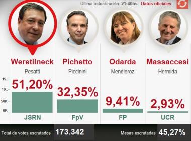 Con el 4.63 por ciento de las mesas escrutadas, el candidatos de Juntos Somos Río Negro se imponía con el 51,79 por ciento de los votos, mientras que Pichetto cosechaba el 31,96 por ciento.
