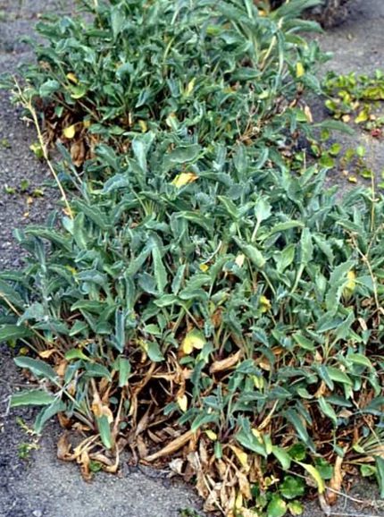 Es una planta perenne, de pocos tallos de aprox. 30 a 50 cm de altura y en sus extremos se encuentran pequeñas florcitas blanco-rosadas. Las hojas se amontonan en la base del tallo, de consistencia dura, algo carnosas, verde grisáceas y lisas. Florece en el verano.